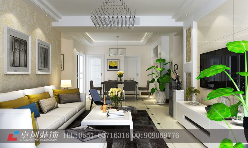 客廳效果圖:整體的白色家具配上黑色的地毯,形成一種沖突的美感,增加了整個(gè)空間的色彩豐富的。別致的吊燈也增添了一些趣味性。