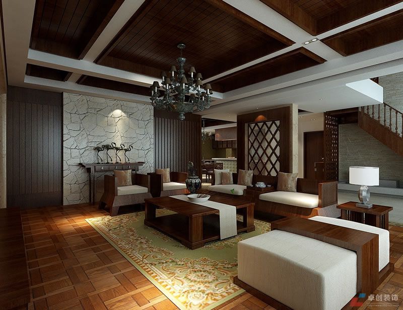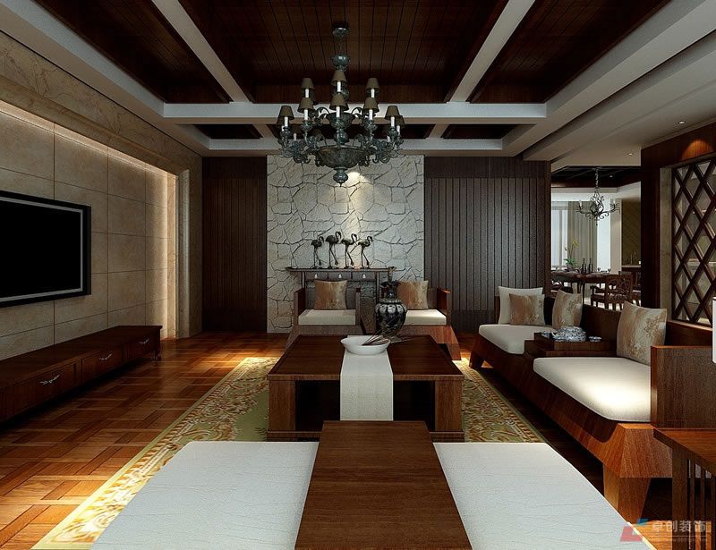 客廳裝修效果圖:現(xiàn)代與中式的混搭,原木的吊頂搭配上現(xiàn)代感較強(qiáng)的大理石背景,給空間帶來(lái)自然寬闊的感覺(jué)。
