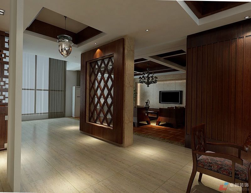 客廳裝修效果圖:古色古香的屏風(fēng)、靜雅的典藏飾品、家具的簡(jiǎn)約線條,一一詮釋著主人的藝術(shù)品味。