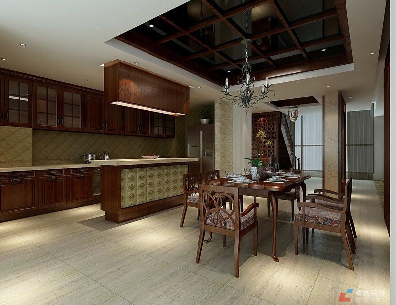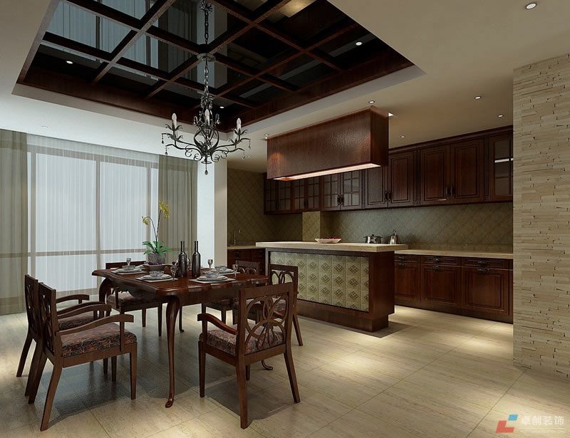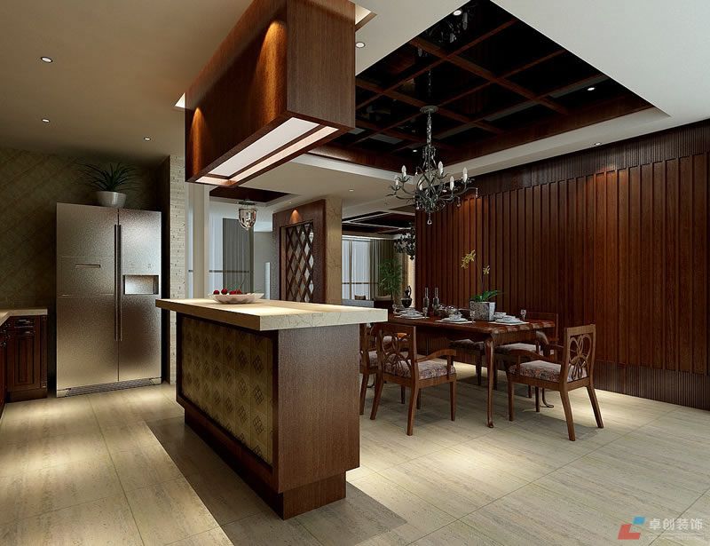 餐廳裝修效果圖:開(kāi)敞式的廚房、餐廳使空間通透明亮,深色的木飾面,韻味深遠(yuǎn),古樸自然。