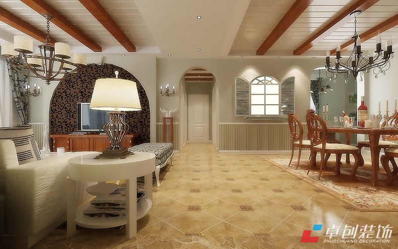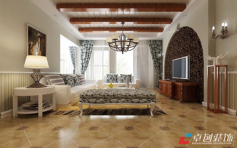 客廳效果圖:客廳的整個(gè)裝修中更多的偏向美式風(fēng)格,拱形的電視墻造型結(jié)合深色的歐式墻紙,以及頂面直線造型配合自然的原木方調(diào),力求表現(xiàn)一種悠閑、舒暢、自然的鄉(xiāng)村生活情趣。