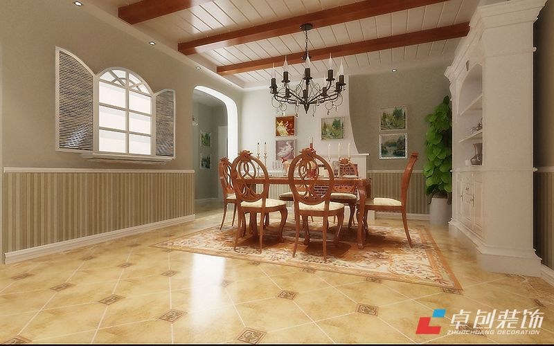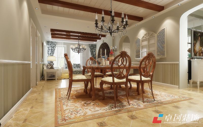 餐廳效果圖:木制椅子,地毯,墻裙?fàn)I造了一種田園的基調(diào),配上自然的鄉(xiāng)村氣息,讓人有一種心曠神怡的感覺(jué),坐在這里用餐甚是一種享受啊!