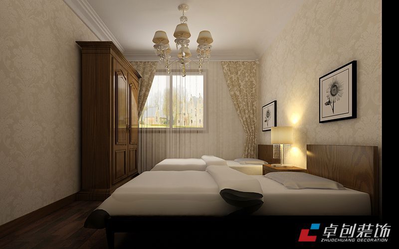 臥室效果圖:臥室的家具簡單,整個臥室背景墻都采用墻紙,自然舒適。