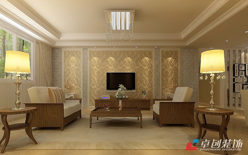 客廳效果圖:獨特韻味的背景墻搭配上木制家具,空間給人的感覺干凈明朗,現(xiàn)出大氣奢華。