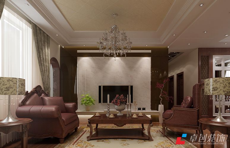 客廳效果圖:影視墻的造型簡潔現(xiàn)代,在吊頂上配以華麗的水晶吊燈,這種絕妙的組合給人以強烈的視覺意志力,成為時尚與古典的柔媚結(jié)合。