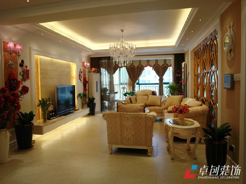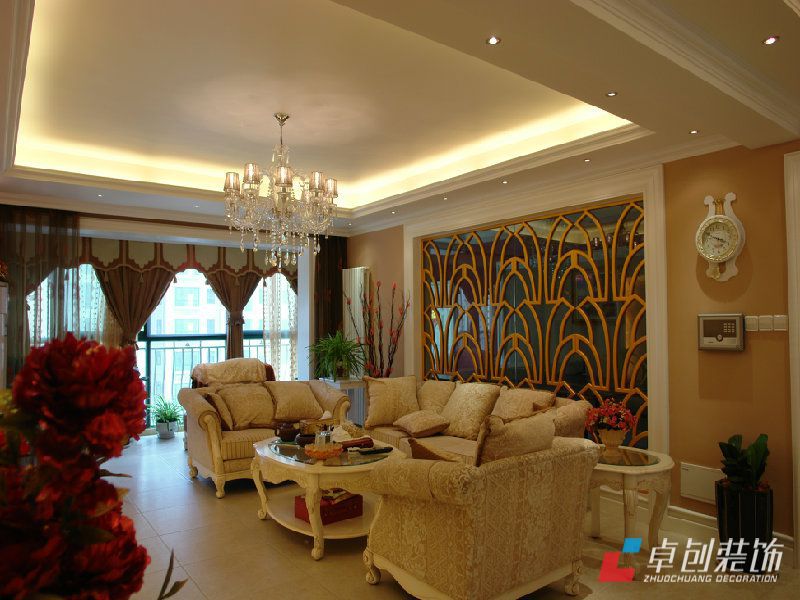 客廳效果圖:簡(jiǎn)歐風(fēng)格的背景墻用米色為主要色調(diào),窗簾選取與沙發(fā)相近的色系。