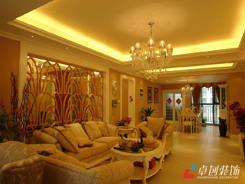 客廳效果圖:沙發(fā)背景墻用花格和玻璃設(shè)計(jì),銀色水晶吊燈盡顯簡(jiǎn)歐風(fēng)情。