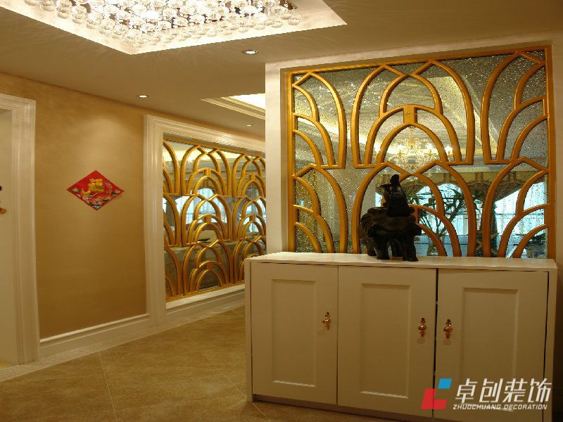 玄關(guān)效果圖: 玄關(guān)的設(shè)計(jì),用金色花格與磨砂玻璃相結(jié)合,過道采光更好。