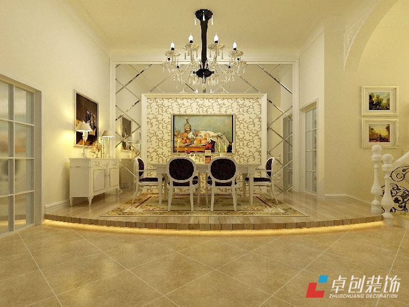 餐廳效果圖:餐廳鏡面背景墻顯得很尊榮華貴,大氣的感覺(jué)。