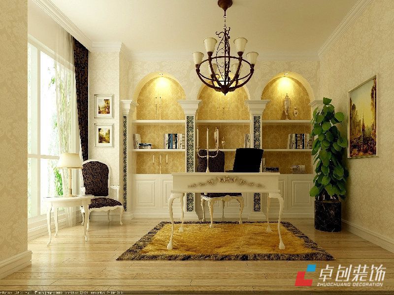 書(shū)房效果圖:書(shū)房以米黃色壁紙為主,書(shū)柜采用歐式拱形造型。