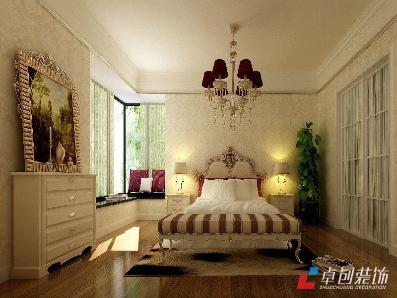 主臥效果圖:沒(méi)有采用過(guò)多的裝飾與色彩的加入,米色的墻紙使空間溫馨而自然。