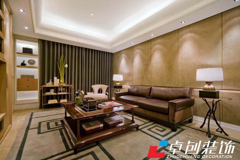 接待室效果圖:皮質(zhì)沙發(fā)與沙發(fā)背景墻同一色系,使整體風格看起來高端大氣,地毯的選擇也要與沙發(fā)背景墻顏色統(tǒng)一??臻g整體要色系統(tǒng)一。